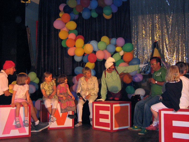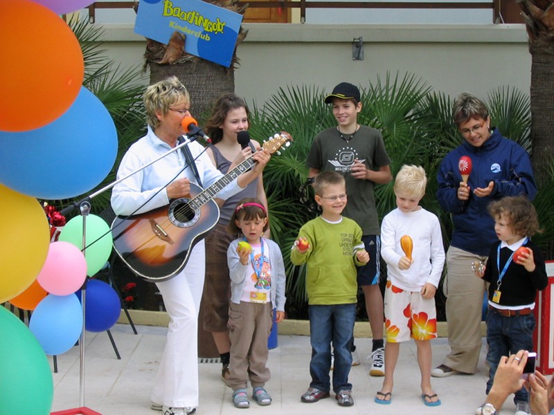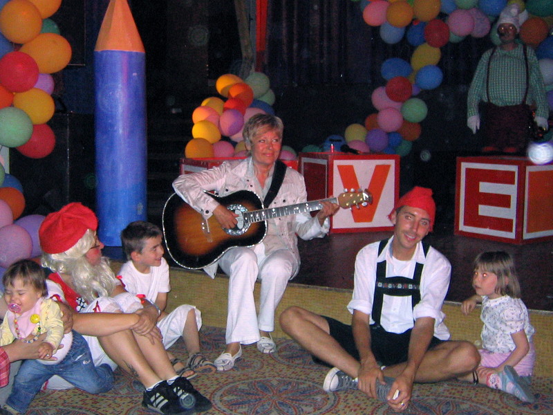 Abends dann die große Gala. Meine Kollegen, die mit mir das Kinderspektakel bestreiten sollten, den Zauberer Phantaro und Kinderliedermacher Eddi Edler, traf ich hinter der Bühne. Nett die beiden. Kurze Begrüßung und dann ging es los. Der coole Olli stellte uns unserem kleinen und großen Publikum vor und wir erzählten, was die Kinder alles beim Kinderspektakel erwarten durften. Zwischendurch nervte immer Zwerg Zipfel, der seinen Freund Zapfel suchte, sehr zur Gaudi der Kinder. Eddi und ich sangen etwas aus unserem Programm, der Zauberer machte ein Zauberkunststück, dann Tusch, Verabschiedung mit dem Clubsong „Baadingoo“ und Schluss. Ich konnte danach kaum einschlafen, so in Vorfreude war ich auf den nächsten Tag.